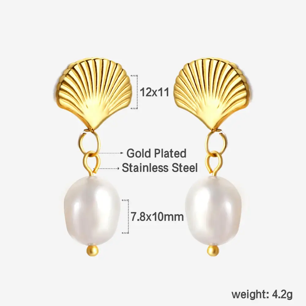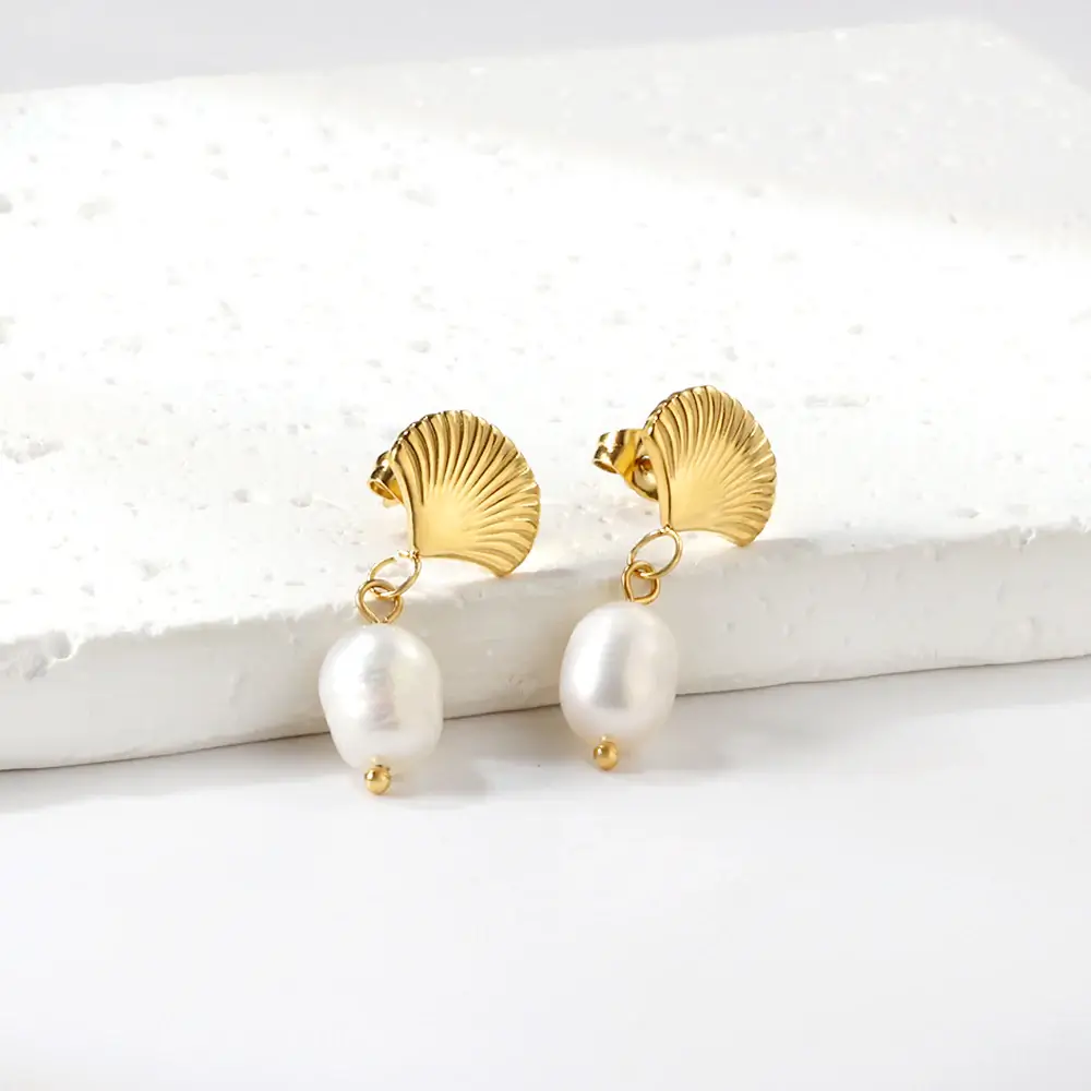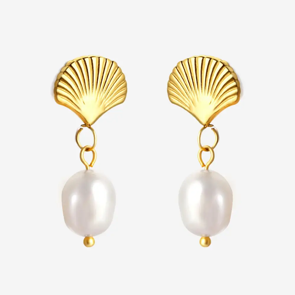 Elegante Perlenohrringe hängend mit goldener Muschel & Perle – stilvolle Ohrringe für Damen. Leicht, hochwertig & hypoallergen.